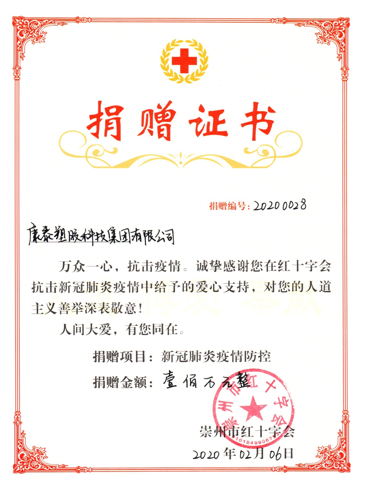 2022.03康泰集團捐款100萬元助力崇州市疫情防控阻擊戰(zhàn)2020年1月,正當全國人民喜迎新春佳節(jié)時,一場突然而來的新型冠狀病毒肺炎疫情肆虐中華大地。面對新型冠狀病毒全民戰(zhàn)爭,直接關系國家民族、企業(yè)興衰、自身安危,康泰塑膠科技集團有限公司作為一家有使命、有擔當?shù)慕ú钠髽I(yè),集團董事長林云青...閱讀人數(shù):8900 -