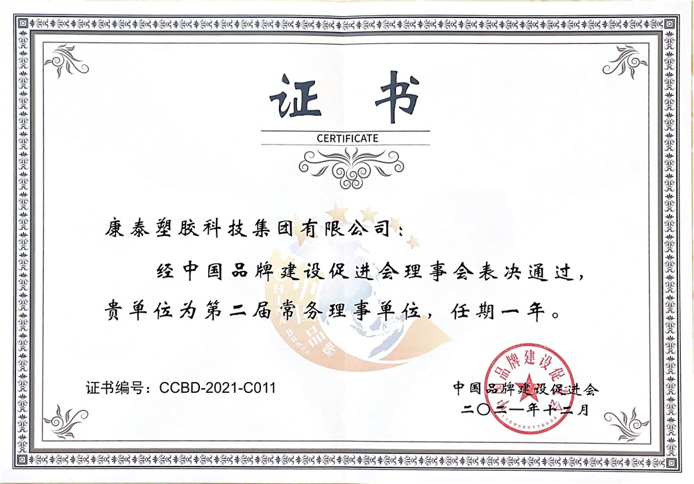 近日,經(jīng)中國品牌建設(shè)促進會表決通過,康泰塑膠科技集團當(dāng)選為常務(wù)理事單位,任期一屆(2021-2022)。中國品牌建設(shè)促進會是經(jīng)國務(wù)院同意、民政部批準(zhǔn)的唯一從事品牌工作的全國性社會團體,旨在促進中國品牌建設(shè)發(fā)展和提高產(chǎn)品質(zhì)量。
