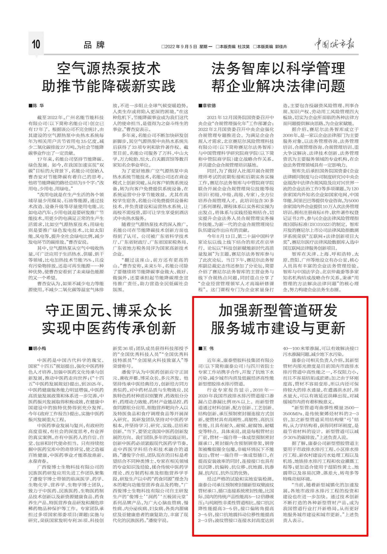 近年來,康泰塑膠科技集團有限公司(以下簡稱康泰公司)與四川省院士專家工作站攜手合作,開發(fā)了抗地下水污染、減少城市內(nèi)澇及低碳經(jīng)濟高性能新型塑膠排水排污管道。