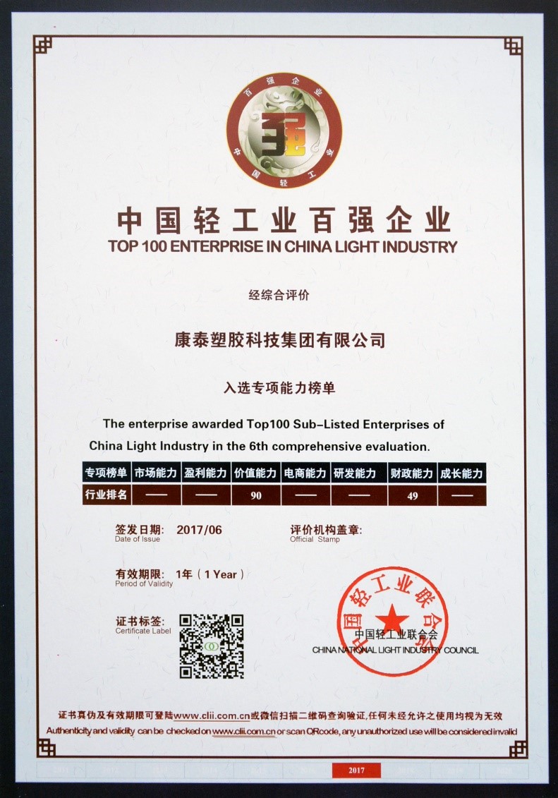 康泰集團(tuán)蟬聯(lián)“中國(guó)輕工業(yè)百?gòu)?qiáng)、中國(guó)塑料管材行業(yè)十強(qiáng)”